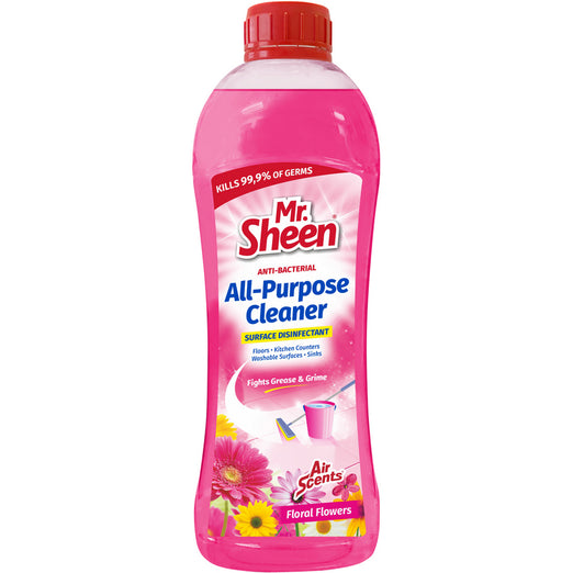 MR SHEEN ANTI-BACTERIAL ALL -PURPOSE CLEANER SURFACE DISINFECTANT. USE ON FLOORS, KITCHEN COUTERS, WASHABLE SURFACES, SINKS. FLIGHR GREASE & GRIME. KILLS 99,9% OF GERMS. AVAILBLE IN OTHER FRAGRNCES.