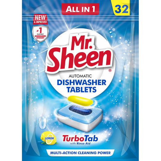 MR SHEEN AUTOMATIC DISHWASHER TABLETS : TURBO TAB WITH RINSE AID, MULTI-ACTION CLEANING POWER. ALL IN ONE. COMES IN VARIOUS SIZES.