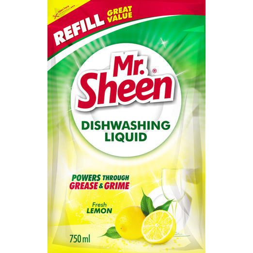 MR SHEEN DISHWASHING LIQUID. POWERS THROUGH GREASE AND GRIME. FRESH LEMON FRAGRANCE.